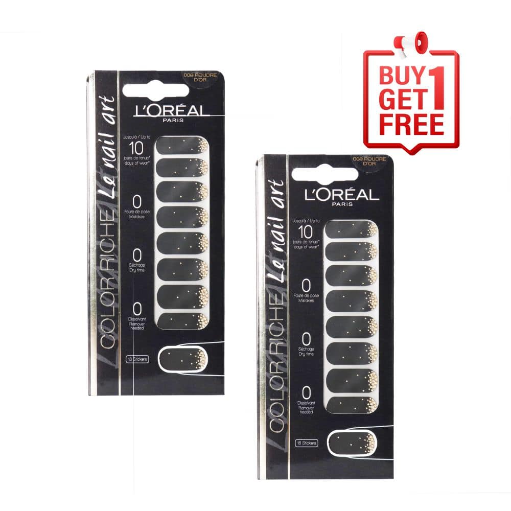 L’Oreal Paris Color Riche Le Nail Art Stickers 009 is the first nail art sticker that features 2D and 3D effects. It is a glitter studded silver-grey semi-transparent design with 3D pearls on it. These stickers are made of nail polish with an adhesive layer on one side and your nail polish color or a design on the other. Nail Art stickers are available in pre-cut sizes that cover the entire nail, replacing nail polish completely. Nail art stickers last up to two weeks. So, give nail art a try with this collection of L’Oreal Paris Color Riche Le Nail Art Stickers, they add fun patterns and shine to fingertips and toes. It is very easy to apply and provides long wear with zero drying time or smudging.